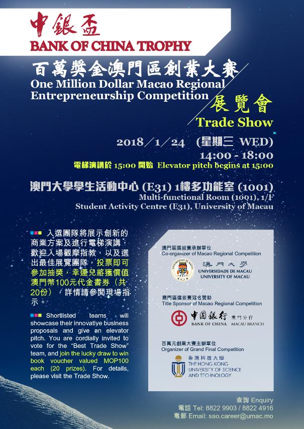 澳門大學將於1月24日舉辦“中銀盃百萬獎金澳門區創業大賽展覽會”,晉級的24支隊伍將展示其商業方案並進行電梯演講。歡迎學生及有興趣人士到場參觀,選出最佳展覽團隊。