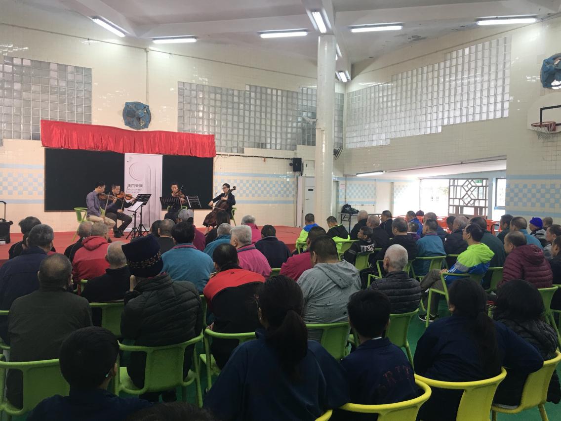 為關懷長者餘暇生活,進行音樂推廣,澳門樂團早前分別探訪了本澳多家老人院及復康院舍,包括恩暉長者綜合服務中心、聖瑪利亞安老院、黑沙環天主教牧民中心、康暉長者日間護理中心、聖類斯公撒格之家及聖瑪嘉烈中心,並舉行《愛音樂獻愛心》新春音樂會,演奏多首經典西方樂曲及膾炙人口的東方音樂,向他們問好致意。一眾“老友記”聚精會神聆聽樂團樂師們的精心表演,曲目包括《春節序曲》、《步步高》、《彩雲追月》等,場面溫情洋溢。樂團總經理曹偉妍、澳門明愛總幹事潘志明等親臨現場,與長者一同欣賞音樂會,並送上窩心的新春福袋禮品包。
