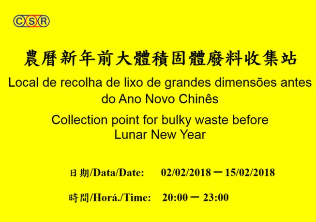 農曆新年將至,為確保城市清潔,民政總署聯同清潔專營公司於新年前夕在全澳各區設置128個大體積垃圾收集站,並呼籲市民配合有關安排,避免垃圾堆積。