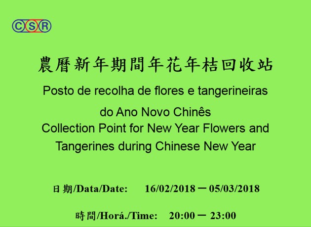 按照傳統習俗,市民會購置年花、年桔佈置家居,因此每年春節後有大量年花、年桔被棄置。為善用綠色資源,民署將於二月十六日至三月五日把大體積垃圾收集站改為年花年桔收集站,並更換相關指示牌,以便市民知悉。市民可於上述期間的晚上八時至十一時,把不再使用的年花年桔放置在收集站內。民署會將回收的年花和年桔破碎及作堆肥處理,其後應用於綠化帶上,以便改良土質。