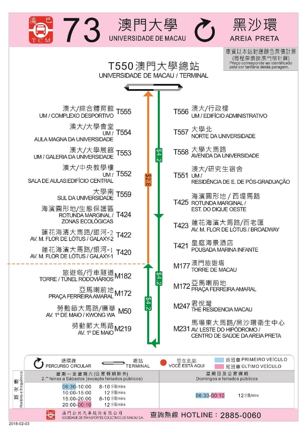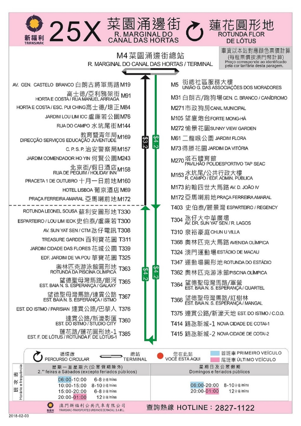 此外,考慮到乘車情況及站點分佈距離,“觀音蓮花苑”站由2月3日(周六)首班車起取消,以提高巴士周轉效率,原使用該站之10A、17、30X路線乘客,可選用“宋玉生廣場” 站或“澳門文化中心”站。