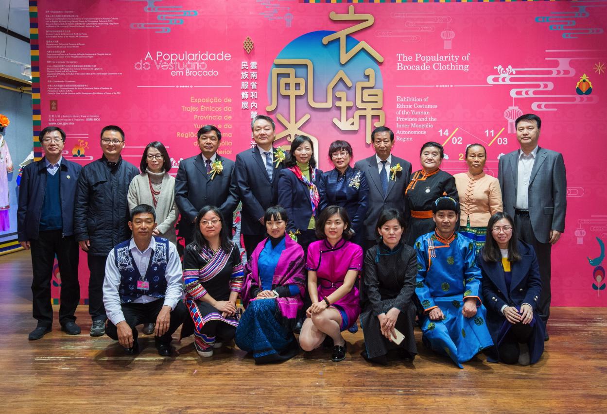 由中華人民共和國文化部港澳台辦公室、澳門特別行政區政府文化局、雲南省文化廳及內蒙古自治區文化廳主辦,中央人民政府駐澳門特別行政區聯絡辦公室宣傳文化部協辦,中華人民共和國文化部民族民間文藝發展中心承辦的《衣錦風尚──雲南省和內蒙古自治區民族服飾展》於二月十三日(星期二)下午六時三十分在盧廉若公園春草堂舉行開幕式,澳門特別行政區政府文化局局長穆欣欣、中央人民政府駐澳門特別行政區聯絡辦公室宣傳文化部副部長級助理邵彬、國家文化部民族民間文藝發展中心副主任王靜、雲南省文化廳副廳長楊德聰及內蒙古自治區文化廳非物質文化遺產處處長趙增春出席主禮。