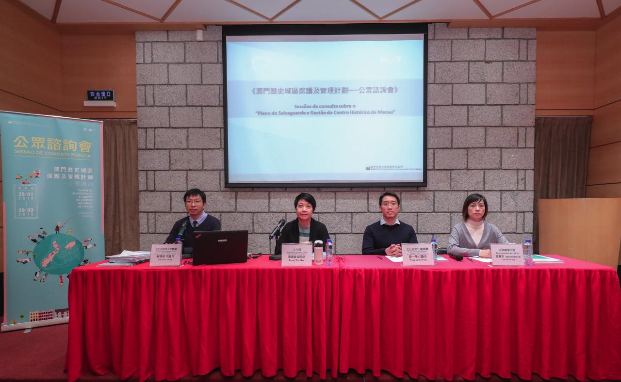 為有效保護世界遺產澳門歷史城區,以及落實《文化遺產保護法》的規定,特區政府正開展《澳門歷史城區保護及管理計劃》第二階段的公開諮詢工作。昨日(三月四日)文化局於澳門博物館演講廳舉行第三場公眾諮詢會,由文化局副局長梁惠敏、文化遺產廳代廳長黃一翔、民政總署代表譚惠芳、文化遺產廳研究及計劃處代處長蘇建明出席,向巿民講解《澳門歷史城區保護及管理計劃》諮詢文本的內容,眾多市民蒞臨參與並積極發表意見。文化局將於三月十一日下午三時在下環街市四樓下環活動中心舉行最後一場公眾諮詢會,歡迎市民蒞臨參與。