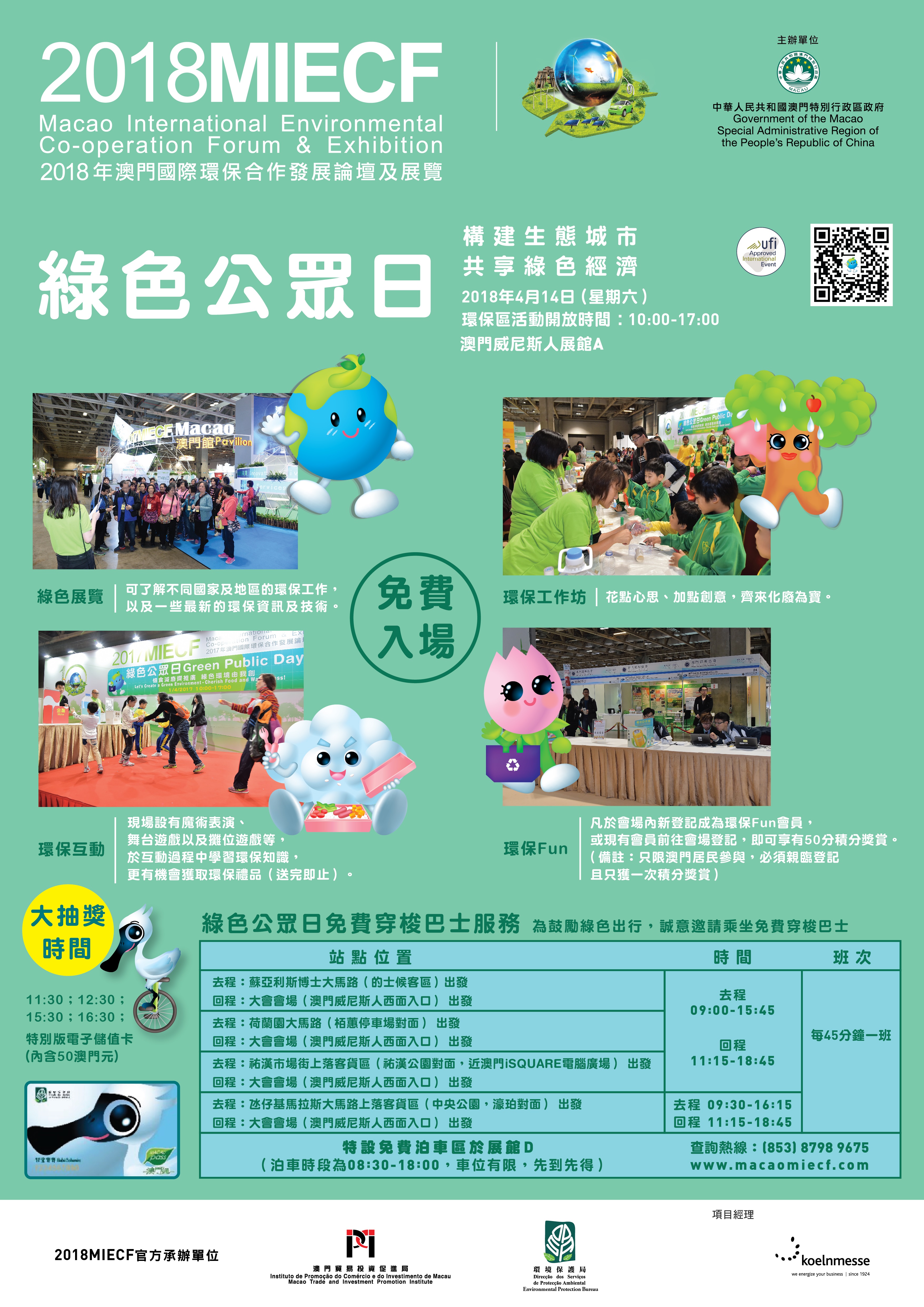 由澳門特別行政區政府主辦之「2018年澳門國際環保合作發展論壇及展覽」(2018MIECF),將於2018年4月12日至14日假澳門威尼斯人舉行,活動最後一天(4月14日)為“綠色公眾日”,免費開放予公眾參觀綠色展覽,藉此宣揚環保訊息,歡迎大家踴躍參與。