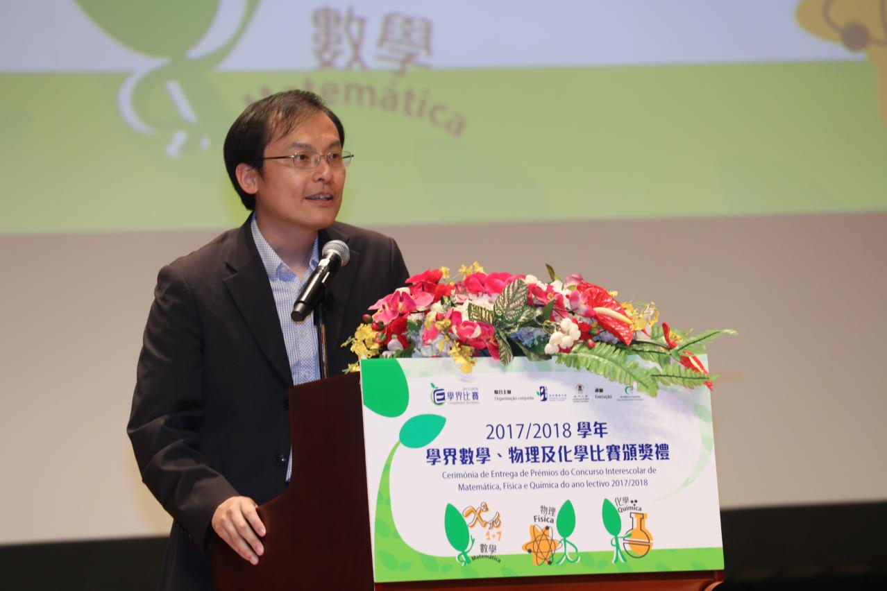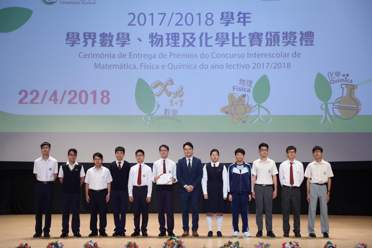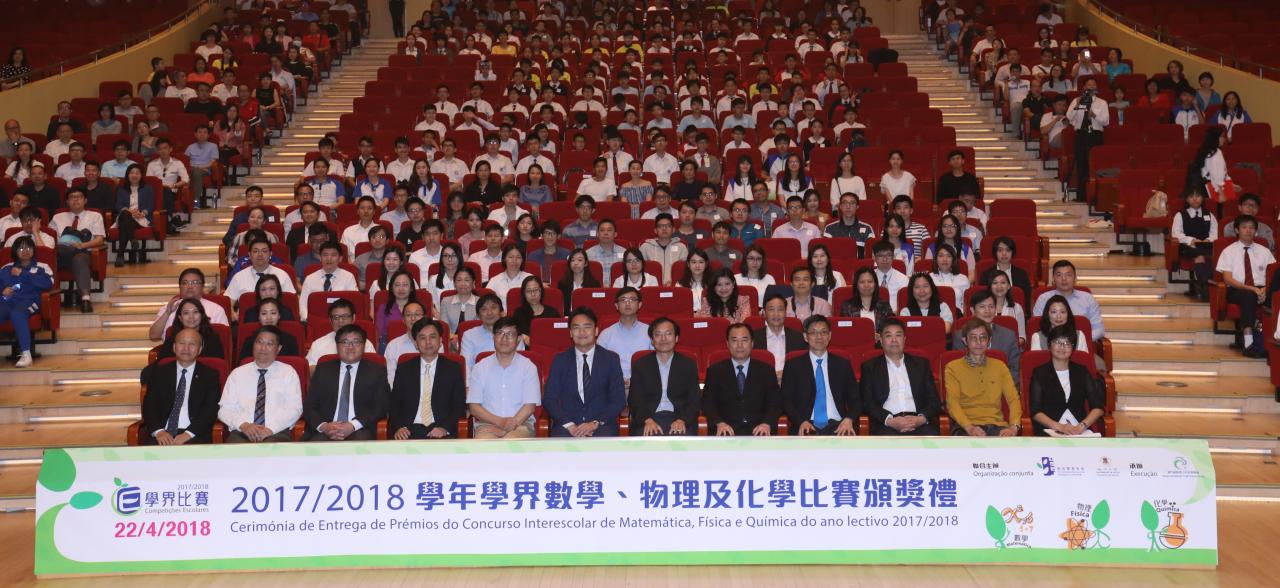 由教育暨青年局及澳門大學合辦的 “2017年澳門高中學生化學競賽” 、 “2018年澳門中學物理競賽” 及 “2018年校際數學比賽” 已順利完成。為表揚獲獎學生在該三項學科比賽中的努力,主辦單位於2018年4月22日下午假澳門大學會堂舉行了2017/2018學年學界數學、物理及化學比賽頒獎禮,分別有217名學生和39名老師獲獎。