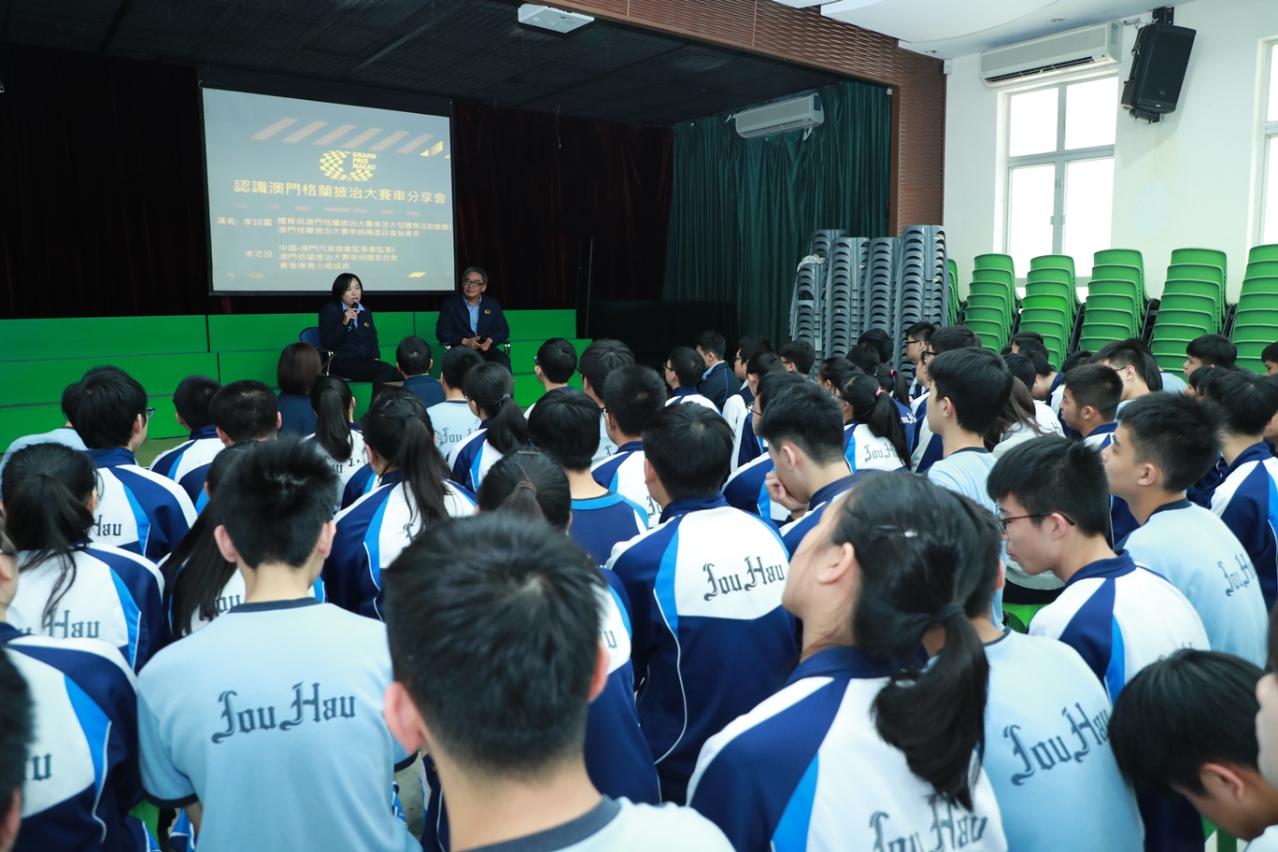 是次活動主題為認識澳門格蘭披治大賽車,主講嘉賓在分享會上介紹澳門格蘭披治大賽車的歷史發展及相關籌備工作等,讓學生們體會到澳門格蘭披治大賽車是屬於澳門人的體育盛事,同時亦是帶動澳門旅遊及經濟發展的知名品牌。學生們對於分享會的內容深感興趣,並踴躍進行發問,現場氣氛熱烈。
