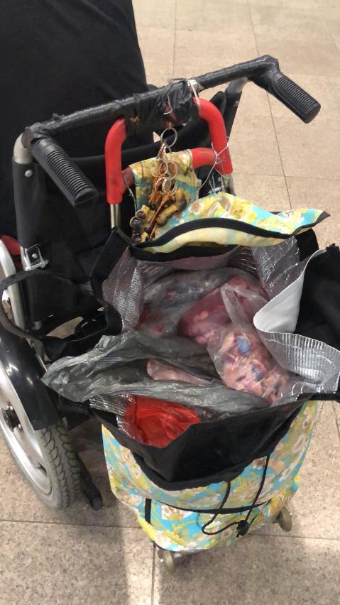 本月13日,一名本澳男子乘坐電動輪椅經關閘口岸進入澳門時,海關關員發現其神色有異,遂向其示意受檢,經檢查在其輪椅後方拖行的手拖車內發現一批新鮮豬、牛內臟及雞肉,合共17.5公斤,上述物品均未經申報及檢疫。