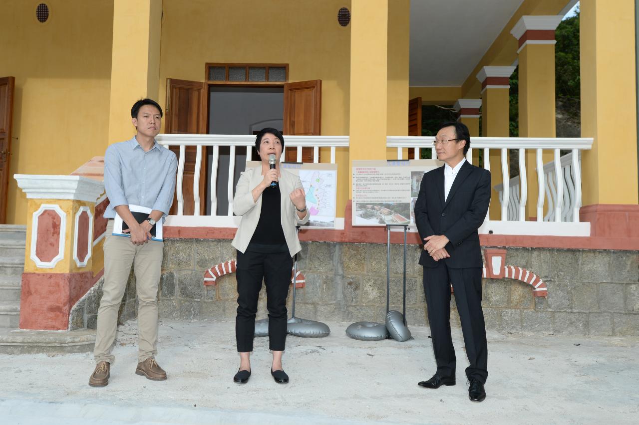 譚俊榮聽取文化局副局長梁惠敏及有關人員介紹九澳聖母村的修復工作,並實地視察現場環境。痲瘋病院五間小屋及教堂,約1885年建成,組成一系列風格統一、充滿建築韻律感的建築群,其後更名為九澳聖母村。
