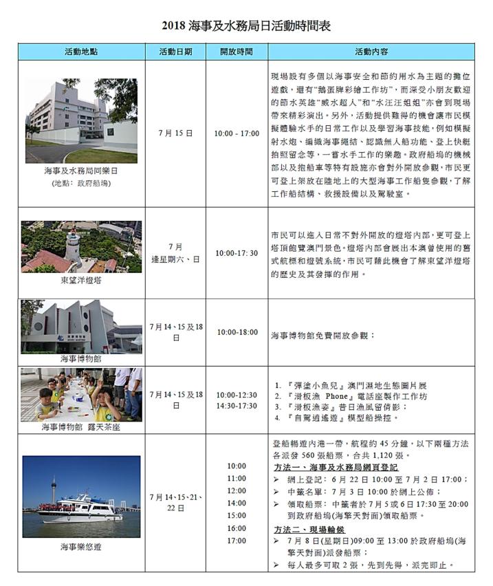 “海事及水務局日”系列活動尚有同樂日、設施開放、海事樂悠遊、海事博物館免費開放、展覽和工作坊,歡迎市民踴躍參與,豐富盛夏餘暇,充實海事見聞,詳情請瀏覽海事及水務局網站http://www.marine.gov.mo。
