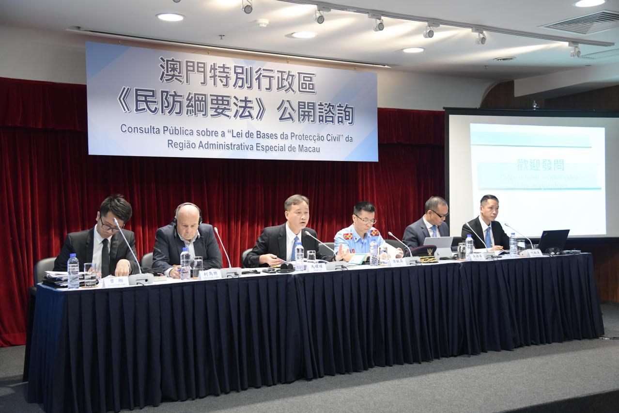 澳門特別行政區政府就制定《民防綱要法》,由2018年6月28日至8月11日展開為期四十五天的公開諮詢。7月2及3日下午在治安警察局出入境事務廳大樓禮堂舉行了兩場團體諮詢會,約190名來自民防架構成員、公共部門、社會團體、義工機構、醫療業界、教育團體及相關學校、物管、建築工程、運輸業、旅遊、酒店及博彩業等代表出席。