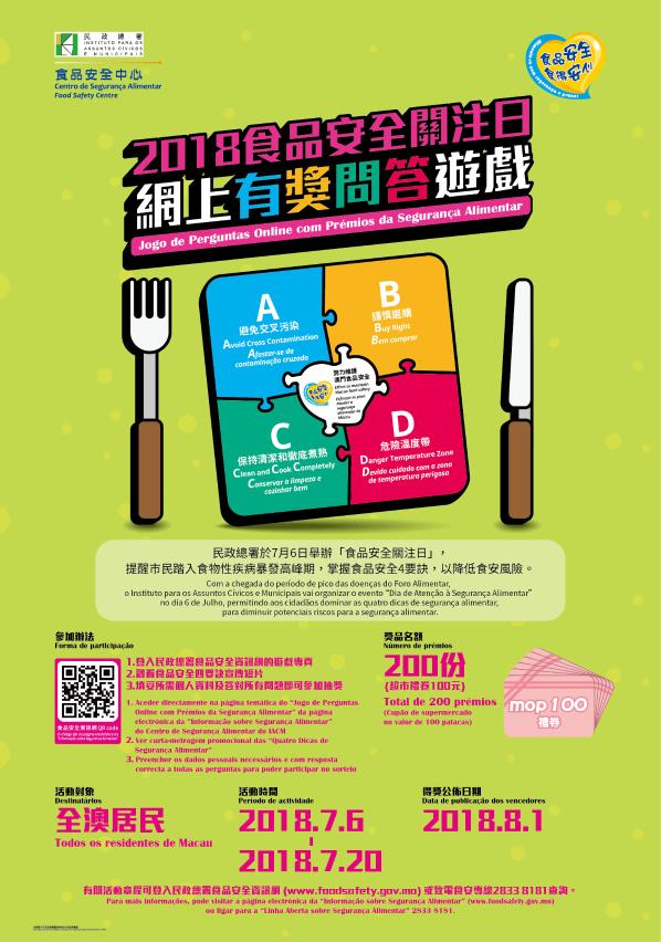 民署將於七月六日至二十日期間推出「食品安全4要訣ABCD」網上有獎問答遊戲,參加者只要登入食品安全資訊網內的遊戲專頁,觀看教育短片並正確回答六條問題,將有機會贏取價值澳門幣壹佰圓超市禮券,獲獎名額共二百名,歡迎市民踴躍參與,得獎名單將於八月一日公佈。「食品安全4要訣ABCD」是民署編輯的一套多語文版本線上教材,內容圍繞避免交叉污染(Avoid Cross Contamination)、謹慎選購(Buy Right)、保持清潔和徹底煮熟(Clean and Cook Completely)、危險温度帶(Danger Temperature Zone),鼓勵不同語言及文化背景人士學習,並運用在日常烹調製作食物之中,有效預防食源性疾病的發生。