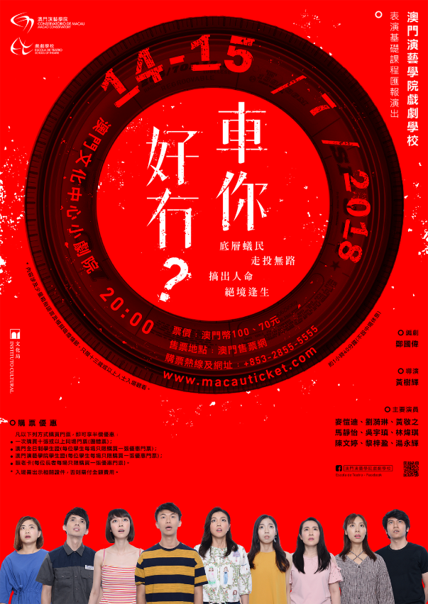 文化局澳門演藝學院戲劇學校將於7月14日(星期六)及15日(星期日)晚上8時於文化中心小劇院演出香港著名青年劇作家鄭國偉獲獎作品《車你好冇》,特邀本澳知名導演黃樹輝執導,門票現於澳門售票網發售,喜愛戲劇的市民萬勿錯過。