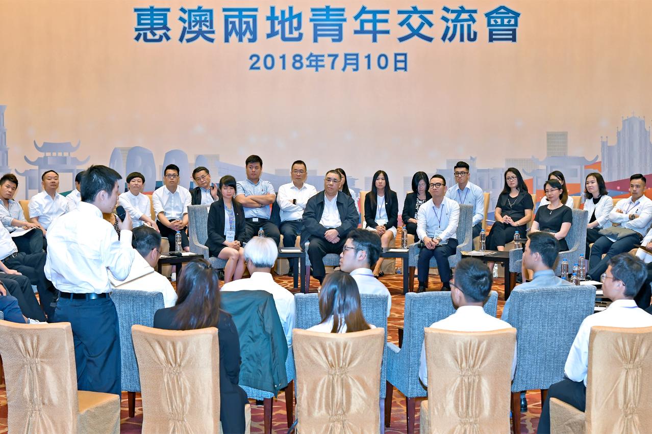 惠州市副市長余金富發言時希望惠澳兩地青年多交流、多走動。惠州經過多年發展,建立了獨特的優勢,亦存在發展機遇;而澳門的發展亦有翻天覆地的變化,年青人應該多到兩地走走看看,加深相互瞭解,並加強交流合作,不論是在球場上、舞台上還是辦公室內,都可進行多種形式的交流。他又期望年青人能主動擔當,積極參與粵港澳大灣區建設及“一帶一路”倡議。惠澳兩地距離雖遠,但他相信隨着交通設施的改善,兩地的距離會愈來愈近,雙方在旅遊、會展、教育、科技、文化、體育等方面的合作,將會進一步加強。兩地雖距離較遠,但交通大為改善,雙方合作有很大空間他深受年輕人的對話啓發,望兩地青年人多交流多走動。惠州有自己獨特的優勢,兩地雖距離較遠,但交通大為改善,雙方合作有很大空間他深受年輕人的對話啓發,望兩地青年人多交流多走動。惠州有自己獨特的優勢,兩地雖距離較遠,但交通大為改善,雙方合作有很大空間