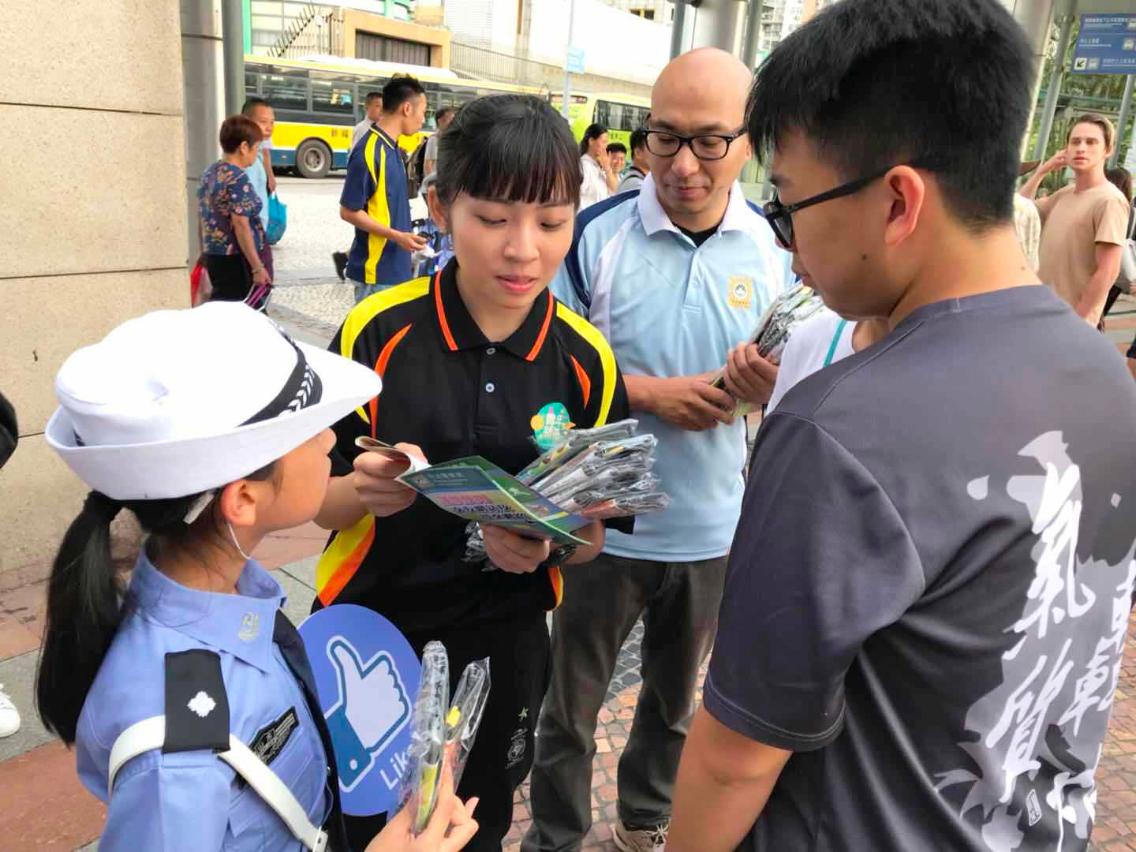 7月18日下午,司警局關注少年組人員組織十多名“滅罪小先鋒種子計劃”及“社區安全青年領袖計劃”學員,聯同到訪交流的山東省濰坊市少年交警先鋒隊學員,在毒品罪案調查處刑事偵查員帶領下到關閘口岸一帶進行預防毒品犯罪宣傳活動,向市民特別是青少年講解吸毒對身心的危害及涉毒犯罪的刑責,提醒他們須堅決拒絕毒品,如發現毒品犯罪活動,應馬上向警方舉報。