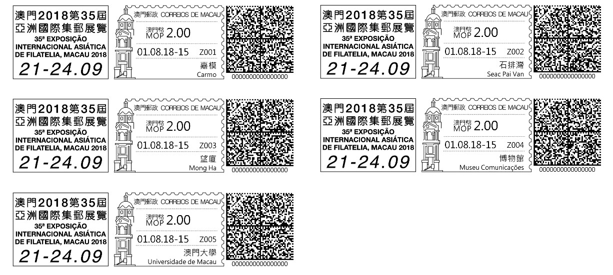 為配合今年「澳門2018第35屆亞洲國際集郵展覽」,郵電局宣布於2018年8月1日至9月24日止,於轄下設有郵資標籤機的郵政分局,包括望廈郵政分局、嘉模郵政分局、石排灣郵政分局、澳門大學郵政分局及通訊博物館商店將會推出新款宣傳印誌標籤 (式樣見下圖)。此款標籤僅適用於櫃檯收寄函件、小郵包及印刷品,不作個別銷售。