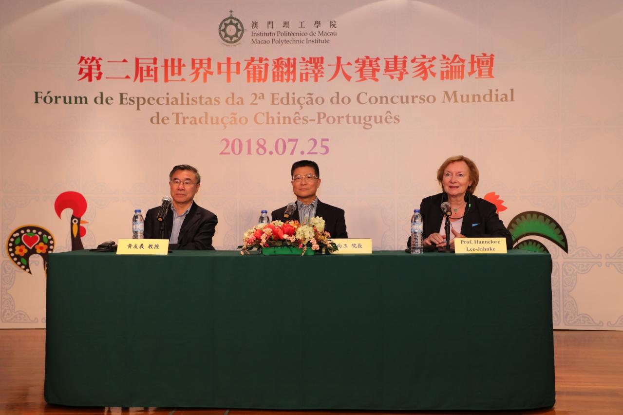 專家論壇上,澳門理工學院院長李向玉發表“澳門理工學院與葡萄牙語教學”,向師生介紹及分享澳門理工學院的中葡雙語翻譯在教學、科研及推廣的發展,特別是過去二十年所取得的成果。為探討未來翻譯的新方向,國際大學翻譯學院聯合會名譽主席、瑞士日內瓦大學翻譯學院多語種研究所主任Hannelore Lee-Jahnke教授發表“跨學科在翻譯和口譯中的重要性”,闡述翻譯和口譯的發展進程,現今社會人工智能已可提供更精準及快捷的翻譯效果,因而未來應集中跨學科的翻譯研究。隨後,中國翻譯協會常務副會長、原中國外文局副局長黃友義教授主講“新時代,我們如何做翻譯?──參加《治國理政》一書翻譯的體會”,分享其參與《治國理政》一書翻譯的經驗和體會,強調翻譯不單能字面直譯,理應深入了解字句背後表達的意義,與及翻譯需要與時並進,更多地吸納現代使用的字詞。