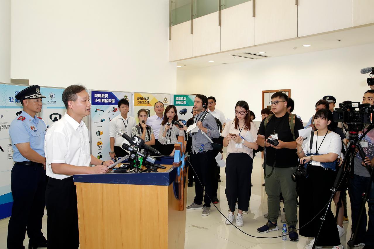 上午三個保安部門由專人向傳媒介紹和展示各類應急救災裝備,當中包括:海關針對停車場搜救添置的無人探測船、纜控水底機械人、蛙人用的水底通話機連全面罩、有夜視及監控功能的玻璃鋼離岸巡邏快艇等;消防局增添了不同型號的橡皮艇、發電機、更大口徑的抽水泵、摩打鋸、鏈鋸等裝備;治安警察局增添了救援、排險的大型電剪、破門工具,以及清除障礙物的電鋸、剪切樹枝機等。