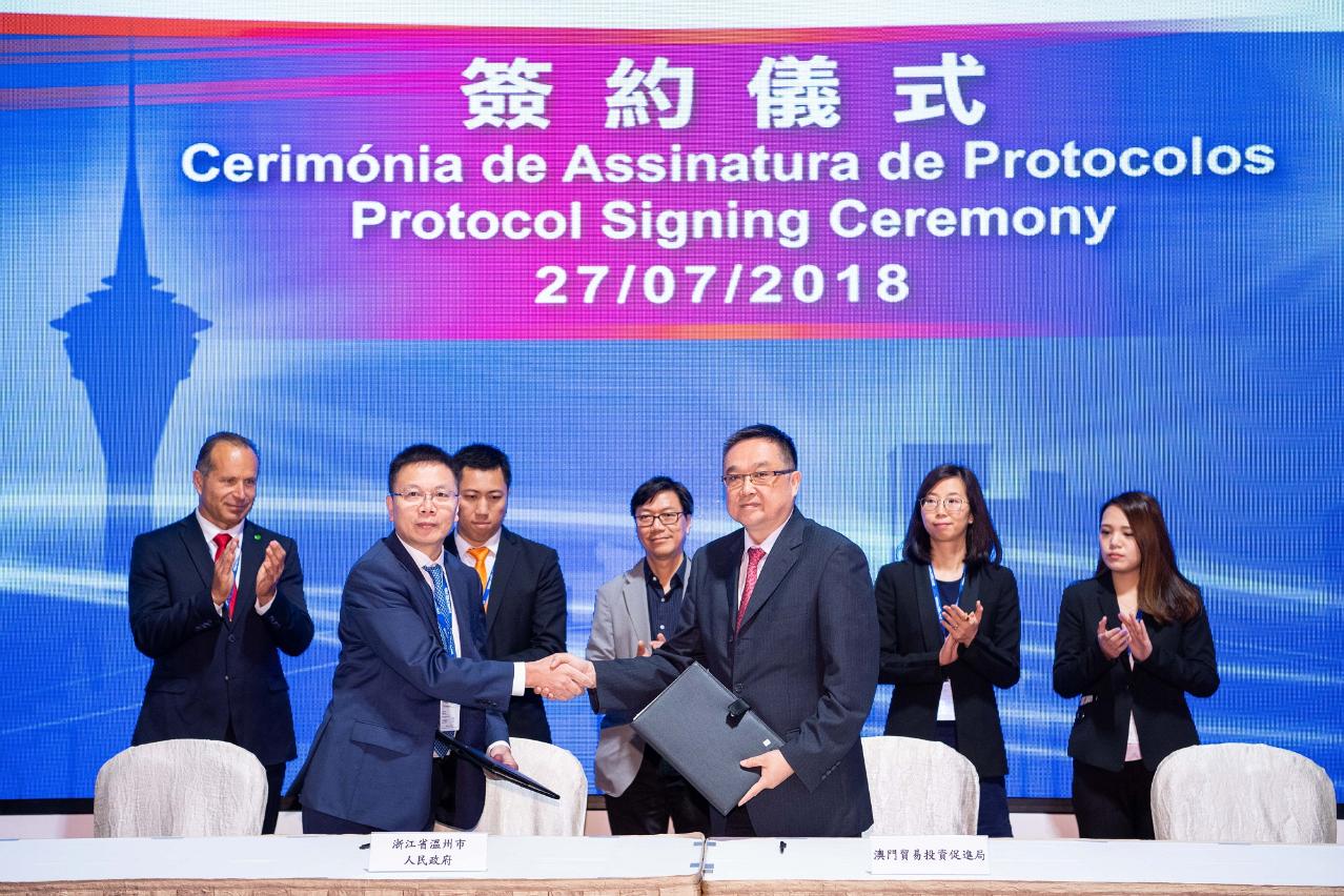 2018MFE透過網上商業配對服務平台於活動首日在商業配對洽談區成功進行了65場會面。首日於簽約儀式中安排了10份簽約項目,內容涉及政府間的商務合作、推進澳門零售行業走進大灣區戰略合作、酒店特許經營、飲品代理銷售、澳門品牌參與活化舊區項目、3D打印設備代理、兒童攝影合作等,簽約方來自中國內地、澳門及香港。