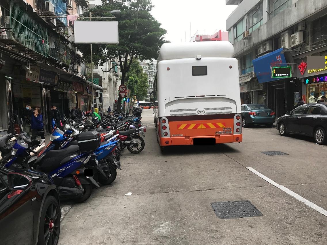 根據巴士公司反映,不少停泊在公共道路泊車位上的電單車突出尾部,佔據道路空間,致使巴士通行時受阻,需減速慢行,甚至有車長需要下車搬動車輛巴士才可繼續行駛,例如:市場街、東望洋新街、得勝斜路左轉入得勝馬路的轉彎位等地方經常有相關情況出現,阻礙交通及影響乘客的出行時間。呼籲電單車駕駛者留意,顧己及人,自覺把車輛停泊在合適的範圍內。