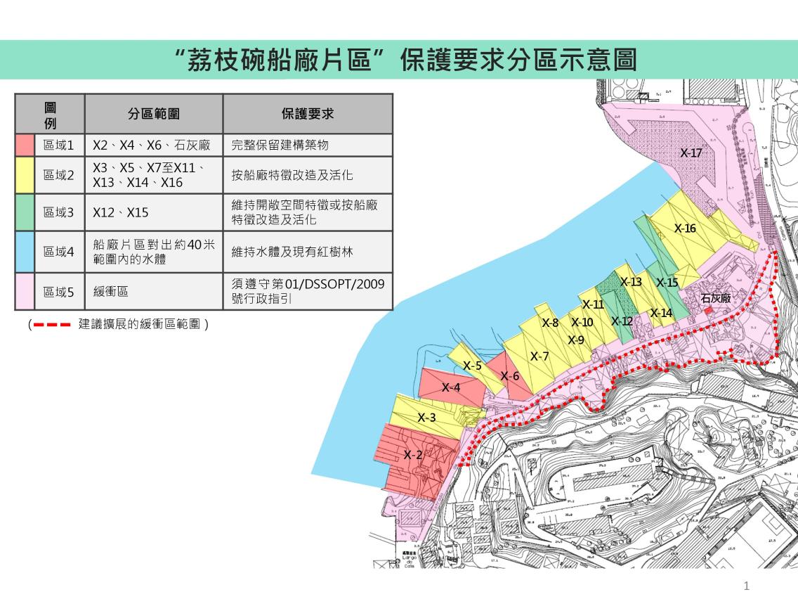 會議上,文化局向委員會介紹有關“荔枝碗船廠片區不動產評定”的初步建議。經綜合公開諮詢的市民意見,以及聽取文化遺產委員會活化技術上的專業意見後,文化局已進行詳細的分析及評估,並於會上向各委員提出保護方案。基於荔枝碗船廠片區的特殊性,相關方案分為五個區域,並根據各區域情況提出不同的保護要求,具體為一部分區域需完整保留船廠、另一些區域在將來活化或改造時需依循一定的規範指引,以延續船廠的整體建築特徵;同時為加強該區的景觀的必要性保護,亦建議保護現存的紅樹林及擴大緩衝區的範圍。委員會表示支持,文化局將朝評定的方向進行後續工作。