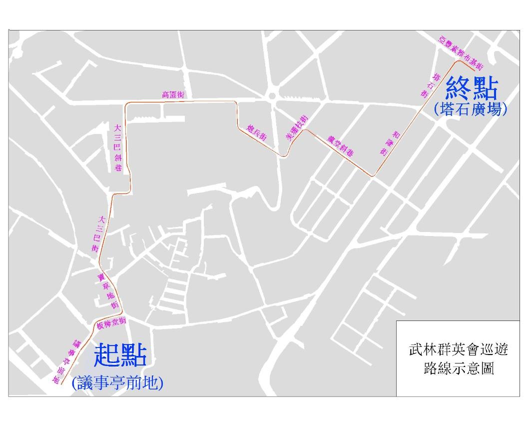 配合體育局舉辦武林群英會巡遊活動,議事亭前地、大三巴及塔石廣場一帶多處道路,8月4日(周六)及5日(周日)下午封閉交通或有限度通車,高偉樂街、高園街及塔石街部份泊車位及上落客貨區則由8月2日(周四)起分階段暫停使用(詳見下表)。