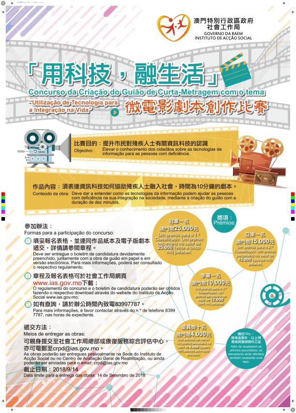 為推廣資訊科技協助殘疾人士融入社會的訊息,社會工作局現正舉辦「用科技,融生活」微電影劇本創作比賽,歡迎市民大眾踴躍參與,截件日期為9月14日。