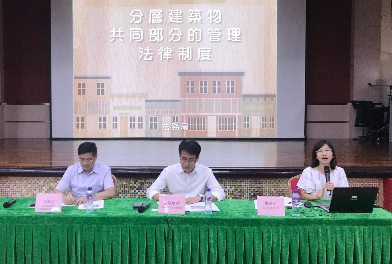 8月8日,法務局與民眾建澳聯盟合辦《分層建築物共同部分的管理法律制度》講解會,對象主要為北區大廈的小業主大會及管委會的骨幹成員。民眾建澳聯盟副理事長歐陽廣球、副監事長兼大廈事務委員會主任袁漢均、大廈事務委員副主任廖國宏,以及負責相關工作的前線人員等逾百人員出席。講解會由法務局法律人員羅麗萍主講,內容包括小業主大會的召集、管理機關的組成、提供物業管理服務合同的訂立等。