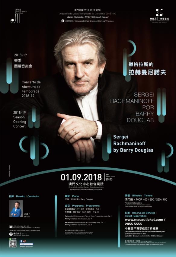 新樂季率先呈獻《2018-19樂季開幕音樂會——道格拉斯的拉赫曼尼諾夫》,於9月1日晚上8時在文化中心綜合劇院隆重舉行,由樂團音樂總監呂嘉執捧,並邀請1986年奪得世界最著名的國際音樂大賽之一、難度極高的莫斯科柴可夫斯基鋼琴大賽金獎殊榮的巴瑞.道格拉斯擔任鋼琴獨奏,繼上次與澳門樂團合作拉赫曼尼諾夫的第二鋼琴協奏曲,備受本澳觀眾愛戴,今次再帶來拉赫曼尼諾夫的第一鋼琴協奏曲,同場獻上林姆斯基-高沙可夫《天方夜譚》,讓樂迷見證一場俄式音樂盛宴。另外,8月30日晚上6時30分在澳門演藝學院禮堂舉辦《樂聚時光——道格拉斯鋼琴大師班》,由巴瑞.道格拉斯大師親自指導交流,欲接受指導及旁聽之人士可致電2853 0782報名。截止報名日期為8月22日,錄取者將獲專人通知並需到本局繳交費用。