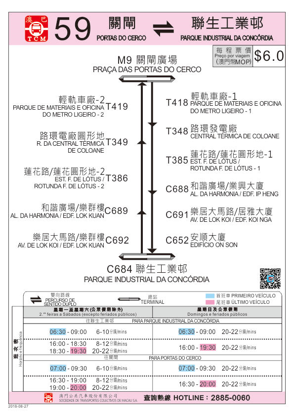 為舒緩石排灣早尖峰時段居民對巴士服務的需求,8月27日(周一)起,59路線新增上午服務時段(詳見附表),同時該路線往關閘廣場方向增加停靠“樂居大馬路/樂群樓”站及“和諧廣場/樂群樓”站,以切合居民的實際出行需要。交通事務局呼籲乘客留意。