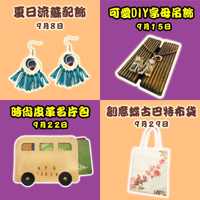 澳門時尚廊“黃昏小敍”自二零一六年開辦以來共舉辦了四十八場手作活動,題材豐富多樣,深受大眾歡迎;繼六月份“黃昏小敍”活動完結後,時尚廊將於九月八日至十一月二十四日期間繼續舉辦該項活動,逢星期六下午三時十五分至五時三十分在時尚廊戶外舉行,期間共設十二場時尚坊,每周均有不同主題,適合各年齡層參與。九月份課程包括“夏日流蘇配飾”、“可愛DIY字母吊飾”、“時尚皮革名片包”及“創意蝶古巴特布袋”,參加名額有限,額滿即止。有意報名者可親臨澳門時尚廊(澳門聖祿杞街四十七號)、澳門生產力暨科技轉移中心成衣技術匯點(澳門漁翁街海洋工業中心第二期十樓)報名。倘當日尚有餘額,接受現場報名。