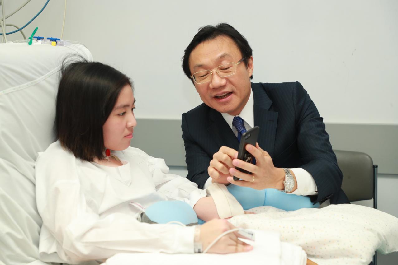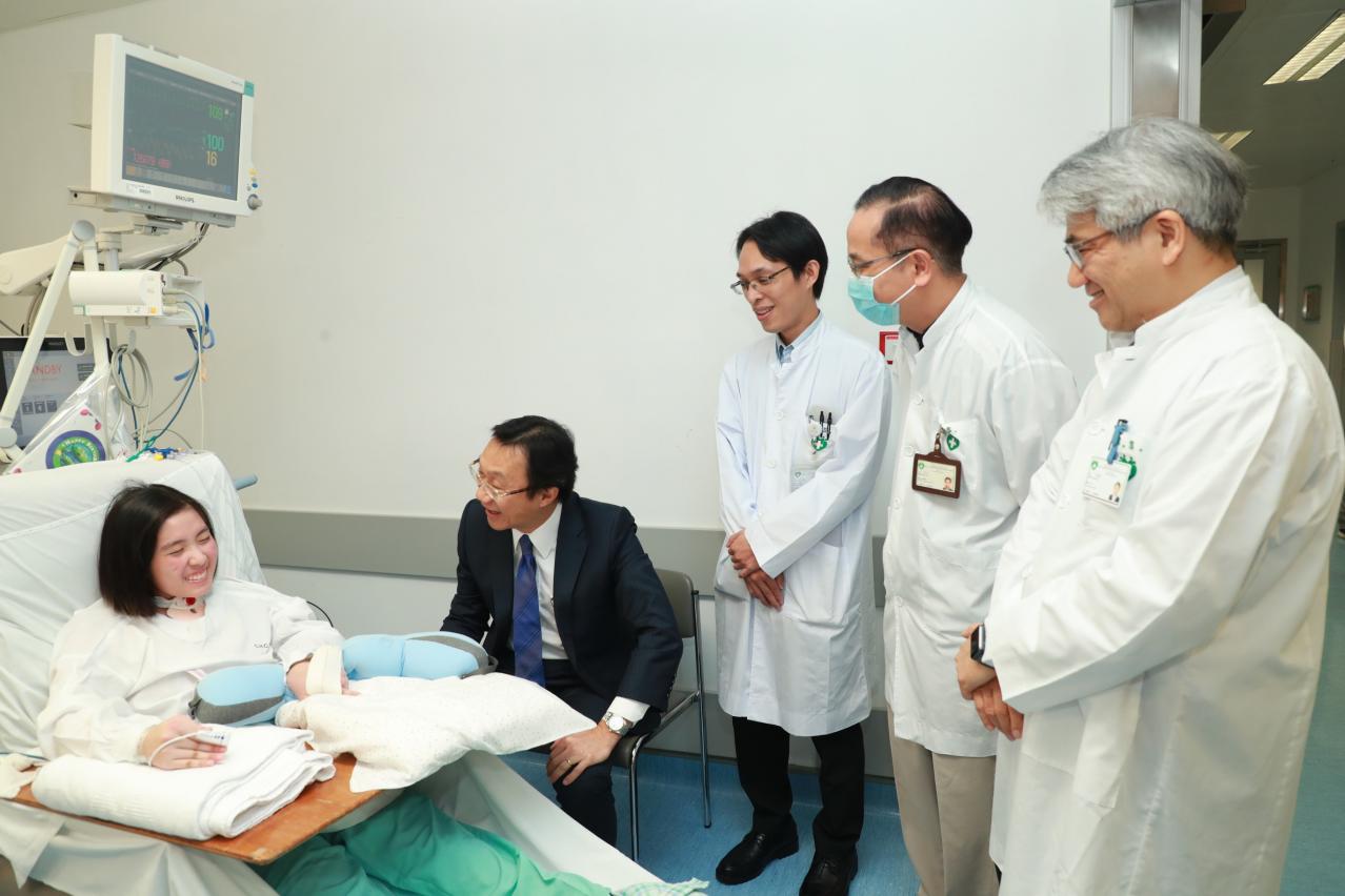 其後,譚俊榮又與患者父母及多位親屬會面,表達特區政府的關切和慰問。他為患者的恢復情況遠遠超出預期感到欣慰,對參與是次救治行動的全體醫護人員給予高度評價;勉勵患者親屬給予患者更多支持,共同面對接下來的康復治療。而對於患者病情出現理想逆轉,患者父親亦對譚俊榮司長一直的關懷,衛生局醫療團隊的努力給予了真摯的感謝;期望女兒早日康復,共同面對新生活。