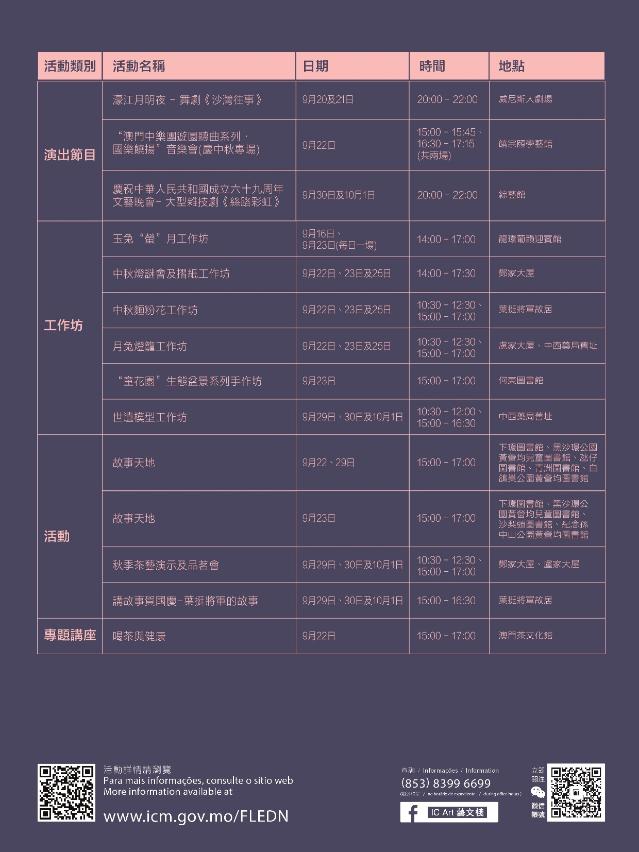 文化局多項藝文設施中秋國慶期間將照常對外開放,各場館之開放時間及休館日可瀏覽文化局網頁。上述部分活動需提前透過“網上活動報名系統”(www.icm.gov.mo/eform/event)報名,各活動詳情可於辦公時間內致電文化局8399 6699,亦可瀏覽文化局網頁www.icm.gov.mo、微信ICMacao及臉書(Facebook)專頁“IC藝文棧”。