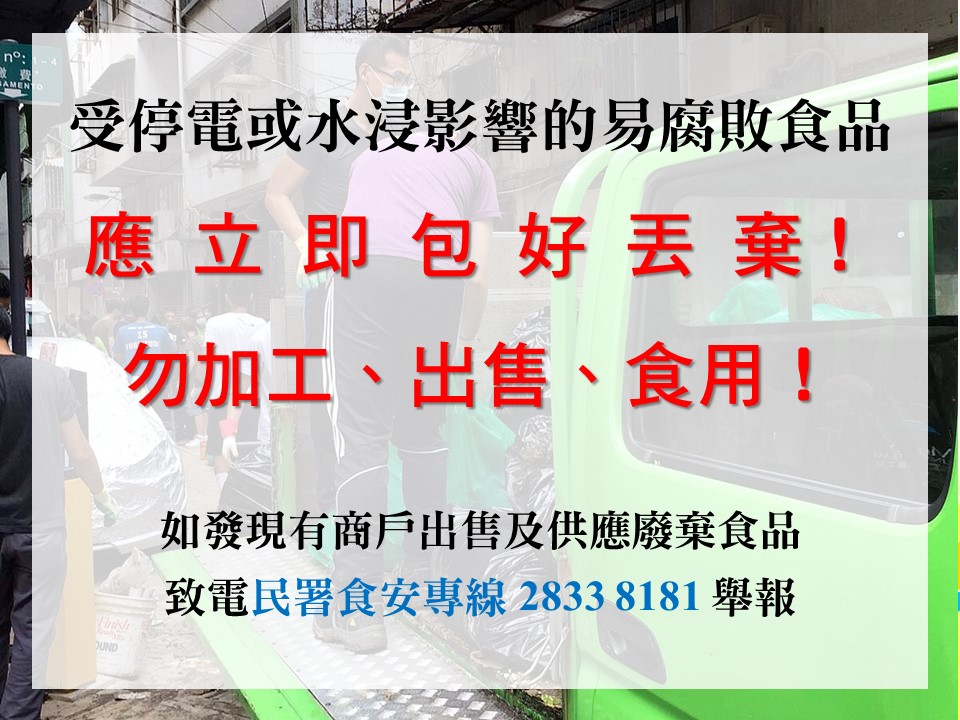 食安中心強調,由於受停電、水浸影響而須報廢的食品存有風險,絕不適宜供人食用。當要銷毀受污染食品時,一定要按照當局指示於指定地點棄置,防止他人撿拾,避免對環境衛生再度做成污染。而任何人士若繼續加工、供應及出售廢棄、腐敗或變質的食品予他人食用,將觸犯《食品安全法》,一經定罪最高可被罰款六十萬元或監禁五年。
