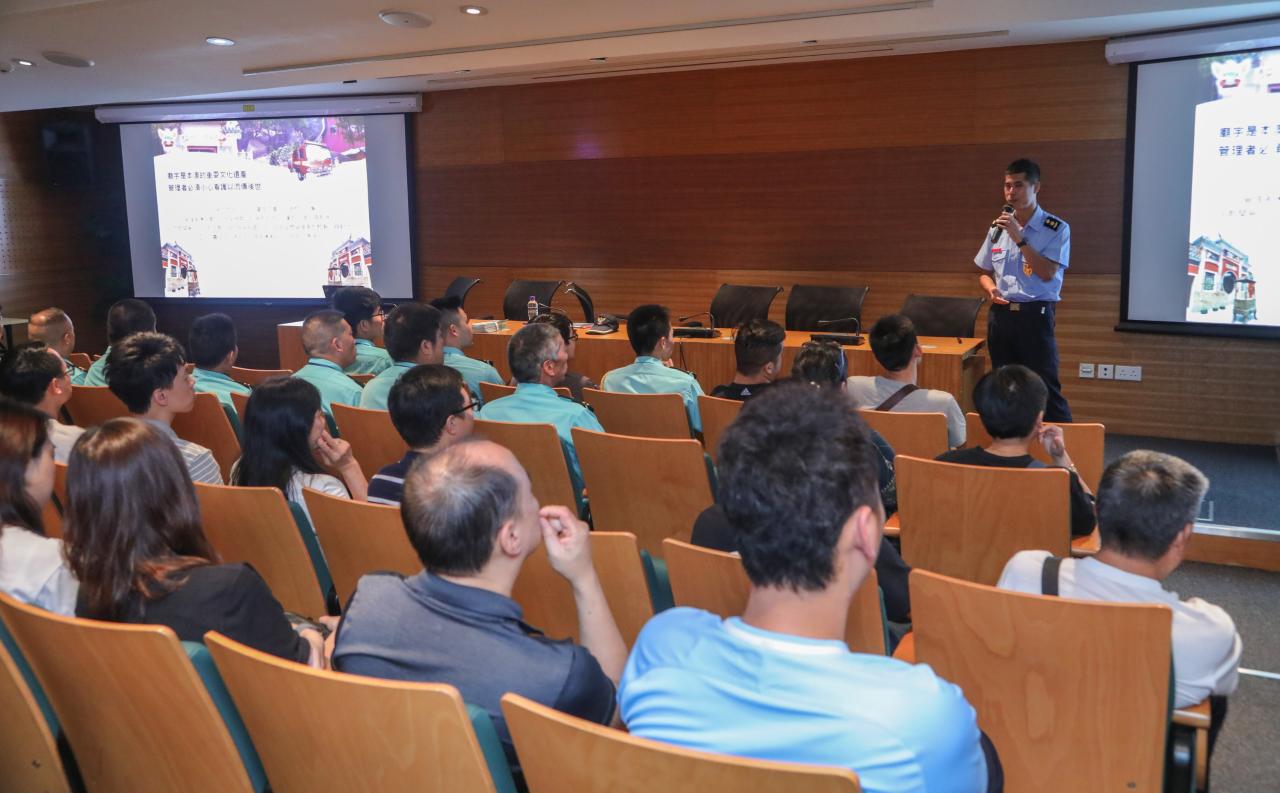 講座共有約50位文化設施管理人員出席,消防局代表向出席人員介紹建築物的特性、注意事項、消防事故、發生事故時的應變措施及逃生技巧等,同時示範了不同類型消防設備的使用,以提升相關人員的防火知識。