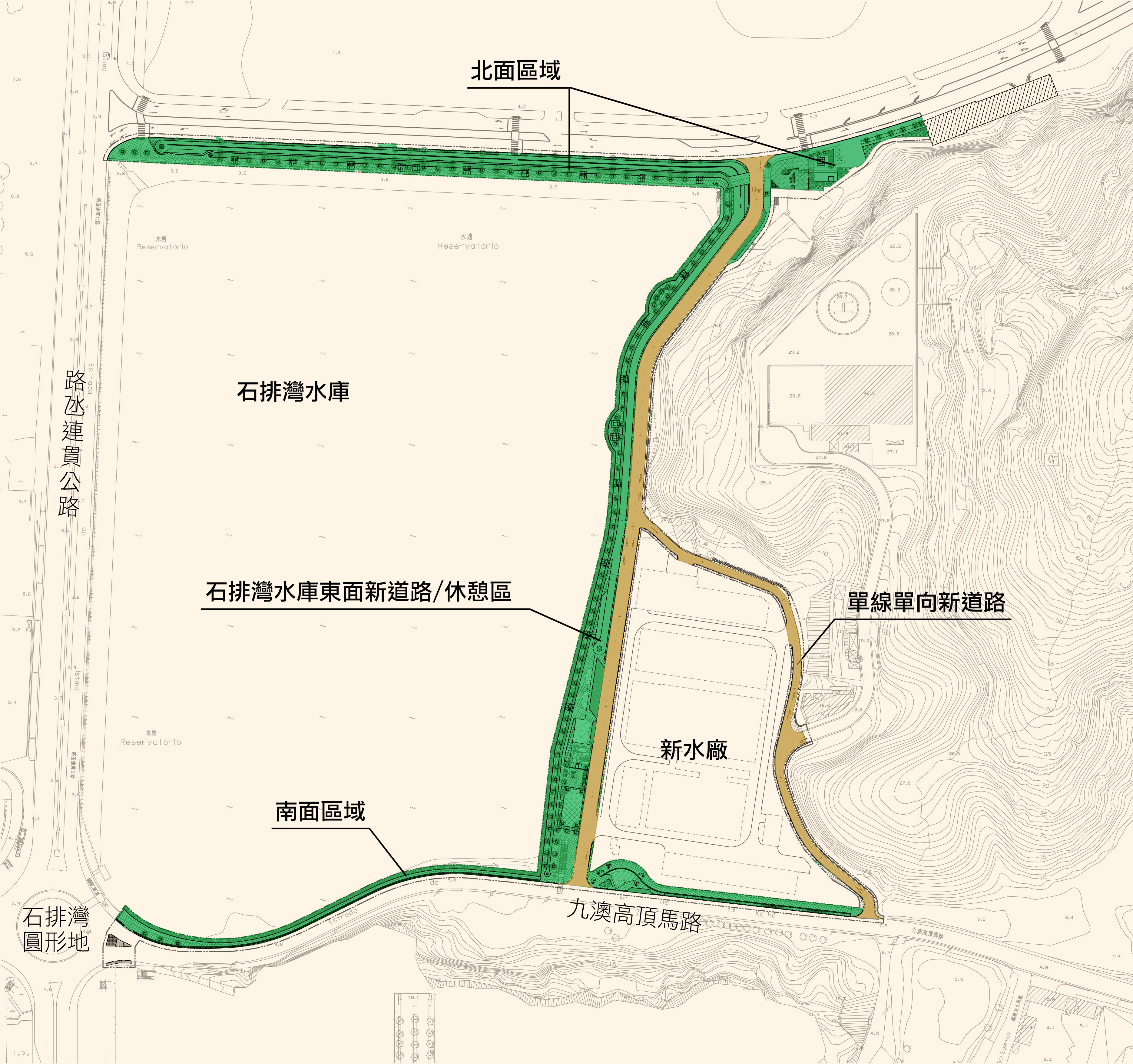 “鄰近石排灣水庫道路及下水道工程”將會在水庫的東側和北側建造一個戶外康體休憩空間,同時亦會擴闊現時南側鄰近路環九澳高頂馬路之行人道。在水庫東側和北側建造的行人道及休憩設施,將設有單車徑、跑步徑、步行徑、兒童遊樂場、康體區及洗手間等設施,並已在附近預留行人天橋落腳點,以便未來建造行人過路設施。