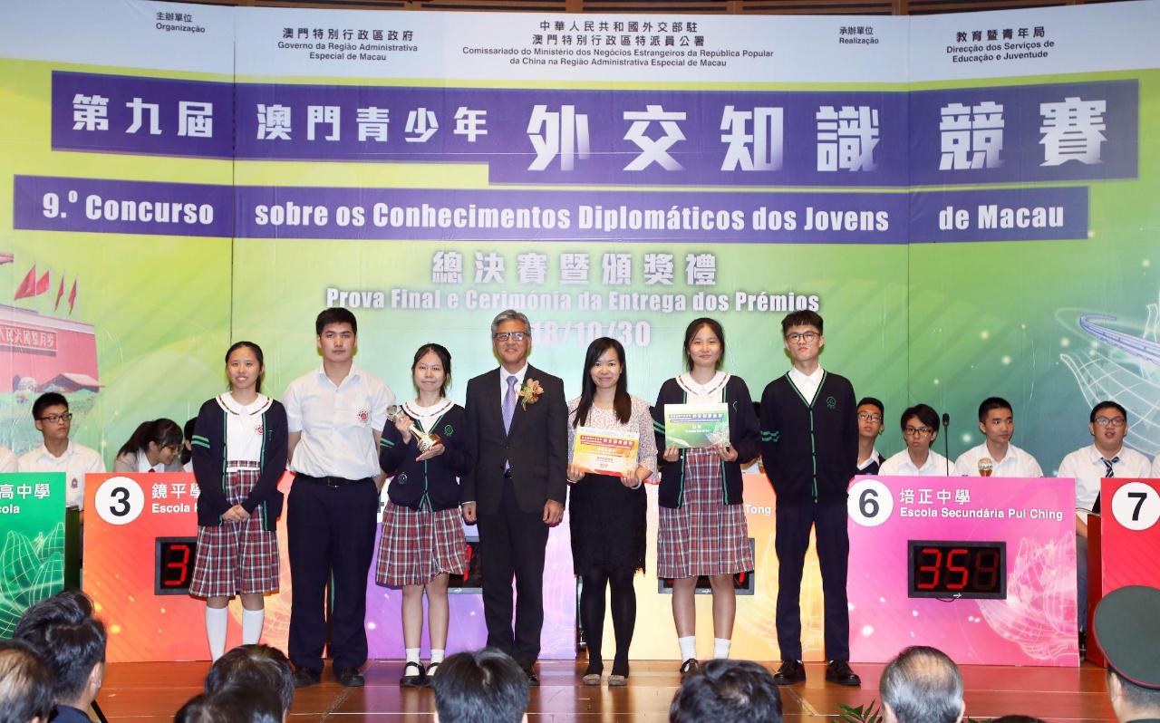 比賽設4個環節,包括選擇題、填充題、搶答題和論述題,內容圍繞國家外交政策、一帶一路國家發展戰略、國際形勢和新聞時事等,以擴闊學生的知識面,啟迪思維。為讓學生多元學習,主辦單位特別設立論述題環節,讓學生以創意演示方式展現對外交知識的掌握,在現場師生此起彼落的吶喊助威聲中,各參賽隊伍均越戰越勇,學生們精彩的表現獲得現場評審及觀眾的一致好評,令人印象深刻。經過一輪激烈的角逐,最終結果是教業中學、澳門坊眾學校、廣大中學及鏡平學校依次奪得冠、亞、季及殿軍。獲得優異獎的學校包括培正中學、聖公會(澳門)蔡高中學、新華學校及同善堂中學。