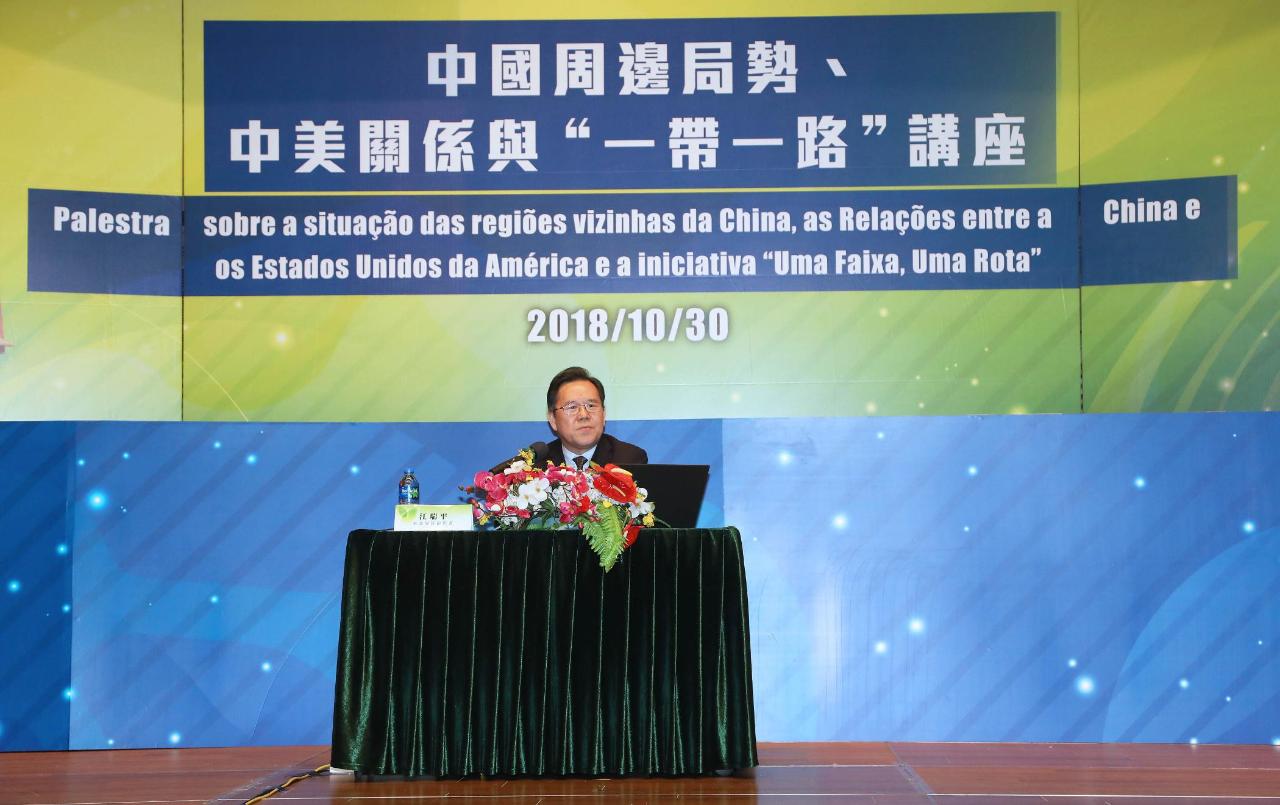 為豐富學生的外交知識,擴闊活動覆蓋面,主辦單位特邀從北京來澳擔任今屆外交知識賽評審的外交學院副院長江瑞平,在總決賽開始前,向澳門青年學生講授了一場以中國周邊局勢、中美關係與“一帶一路”為題的講座,共同分析新形勢下的中國外交,現場學生踴躍提問,獲益良多。