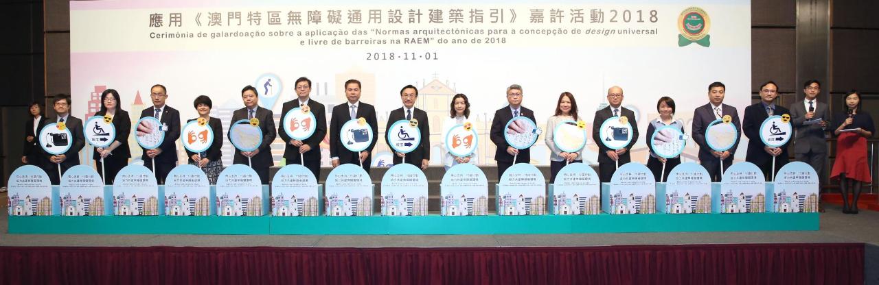 由社會文化司譚俊榮司長領導的康復服務十年規劃跨部門策導小組,今(1日)下午3時半假澳門旅遊塔會展娛樂中心4樓舉行“應用《澳門特區無障礙通用設計建築指引》嘉許活動2018” 。社會文化司譚俊榮司長、康復服務十年規劃跨部門策導小組組長,中聯辦副秘書長兼社會工作部黃華蓋部長、社會工作局黃艷梅局長、康復服務十年規劃跨部門策導小組副組長,教育暨青年局老柏生局長、體育局潘永權局長、統計暨普查局麥恆珍副局長、衛生局何鈺珊副局長、社會保障基金行政管理委員會袁凱清副主席、高等教育輔助辦公室曾冠雄副主任、民政總署道路渠務部何萬謙部長、法務局法律推廣及公共關係廳羅靜萍廳長、勞工事務局就業廳孟瑞怡廳長、房屋局公共房屋廳陳華強廳長、交通事務局交通規劃及建設廳鄺偉卓廳長及土地工務運輸局公共建築廳陸惠財代廳長主持了啟動儀式。是次嘉許活動邀請了來自各公共部門及社會服務機構代表逾300人出席。