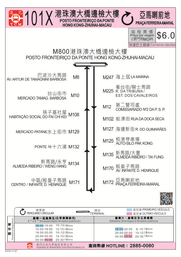 交通事務局經檢視車輛的營運及市民的乘車習慣後,11月7日(周三)首班車起,101X路線於“港珠澳大橋邊檢大樓”站開出後,新增停靠“海上居”站再按原線行駛,以便利乘客往返港珠澳大橋澳門口岸至黑沙環區。