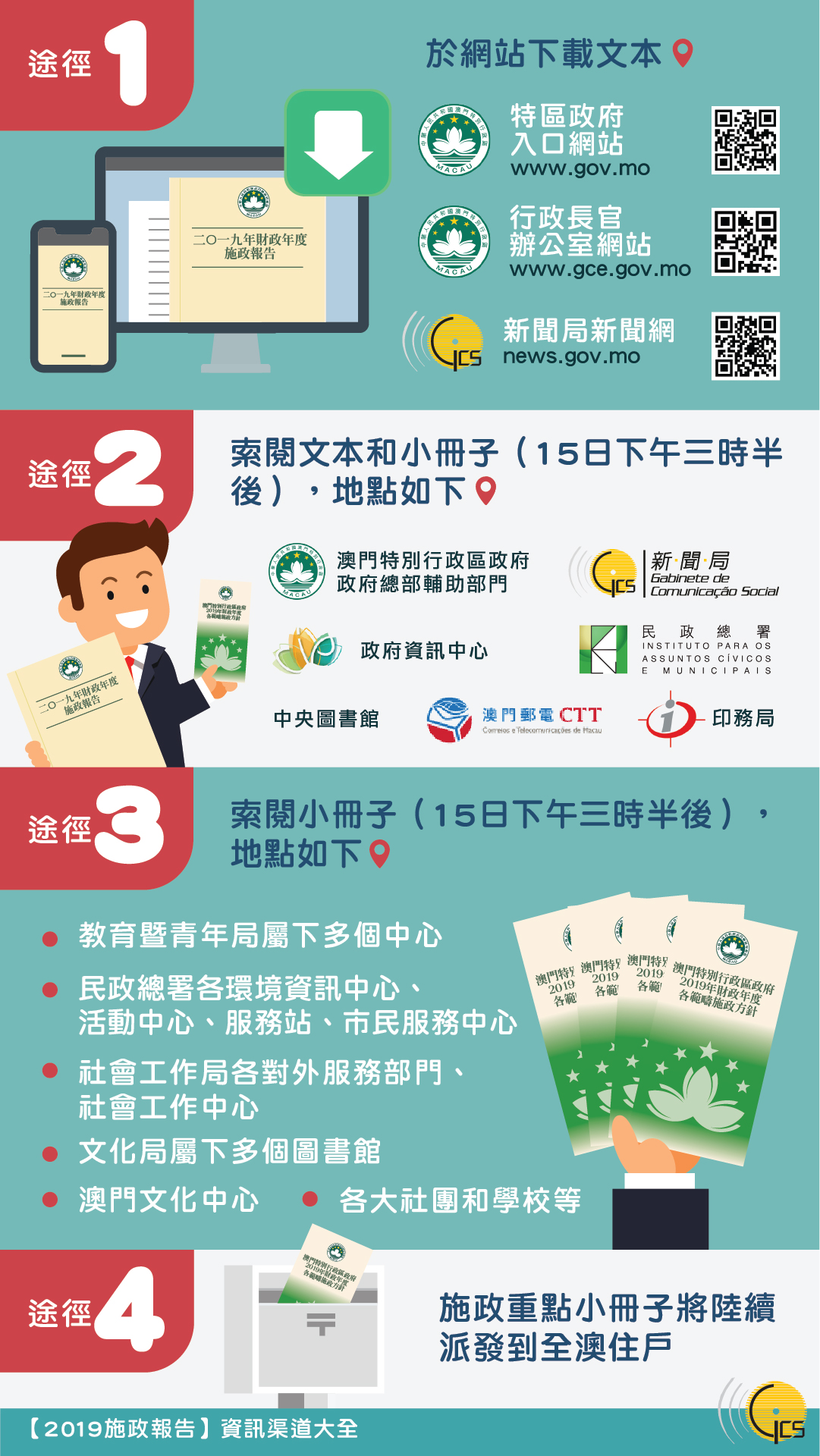 市民如欲下載《2019年財政年度施政報告》的中、葡文本,可瀏覽行政長官辦公室、新聞局和政府入口網站。