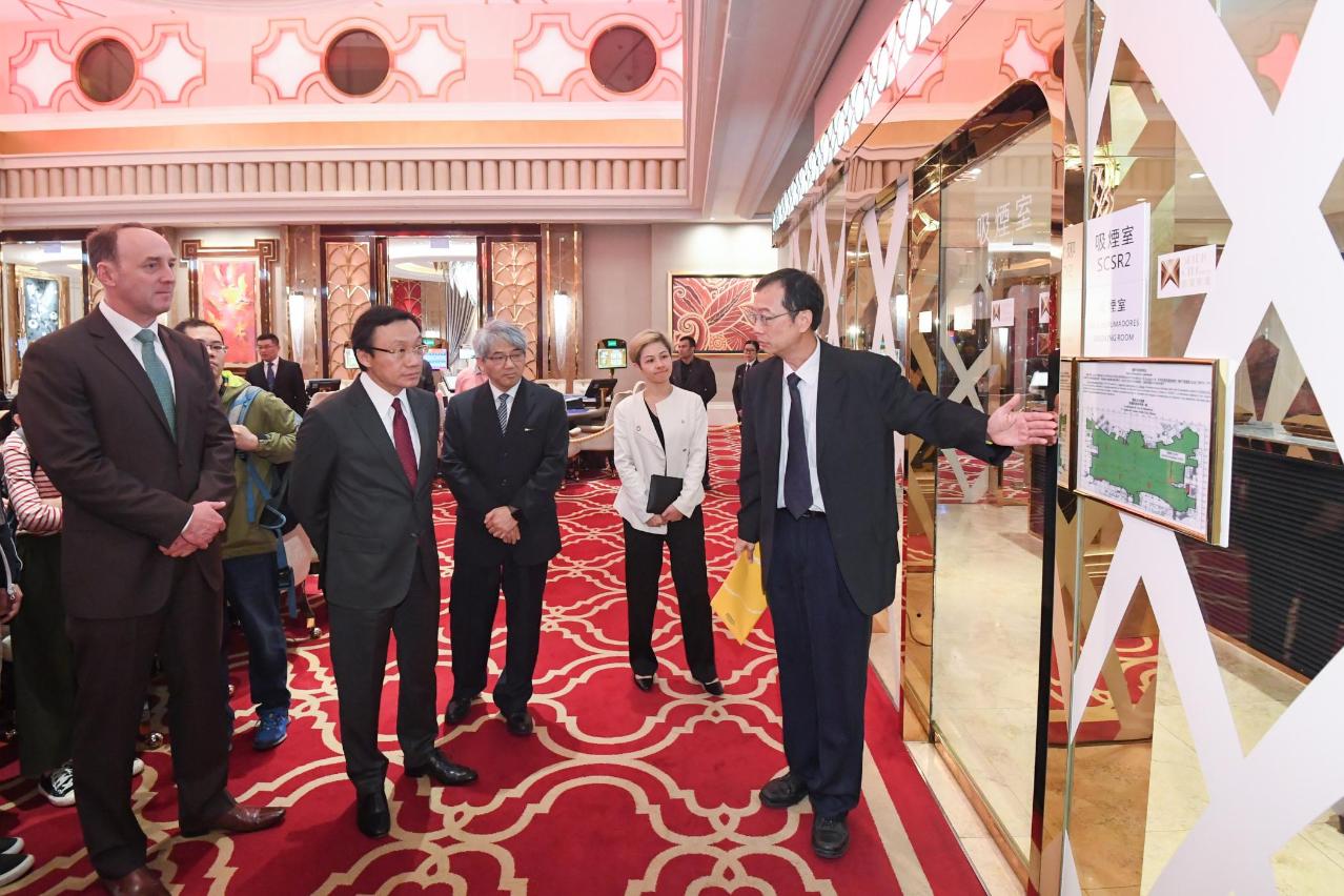 根據新修訂第5/2011號法律,2019年1月1日起娛樂場除已按新標準設置並獲衛生局許可設立的吸煙室外,娛樂場室內範圍禁止吸煙。為深入瞭解娛樂場按新標準設置的吸煙室情況,社會文化司譚俊榮司長於11月14日(星期三)下午到威尼斯人貴賓廳(御扁會)娛樂場及新濠影滙娛樂場進行視察,並指示衛生局須按法律規定和有關要求嚴格審批吸煙室的設置。衛生局李展潤局長、預防及控制吸煙辦公室鄧志豪主任及柯慶建顧問醫生等陪同視察。