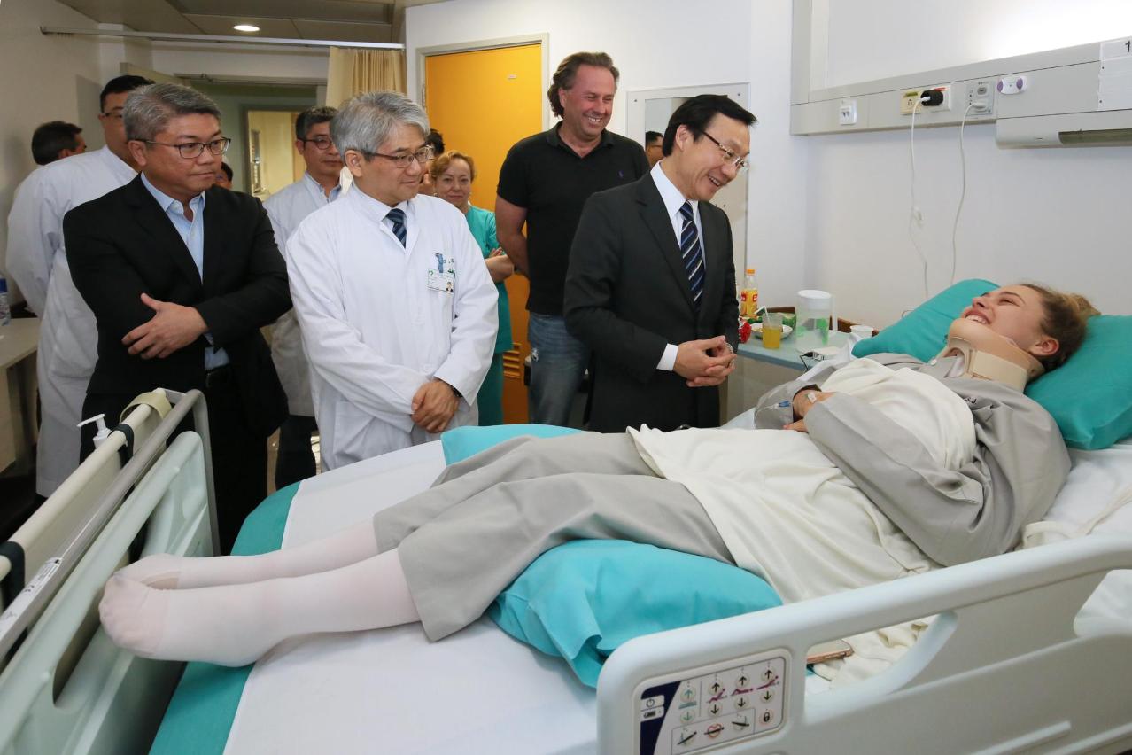 隨同探望的有衛生局局長李展潤,體育局局長、格蘭披治大賽車組委會協調員潘永權,衛生局副局長兼仁伯爵綜合醫院副院長郭昌宇,仁伯爵綜合醫院骨科主任劉懷烈、骨科顧問醫生陳鴻武、骨科專科實習醫生梁志浩、骨科物理治療護士Maria Elisa Gonçalves及骨科護士長袁婉文等。