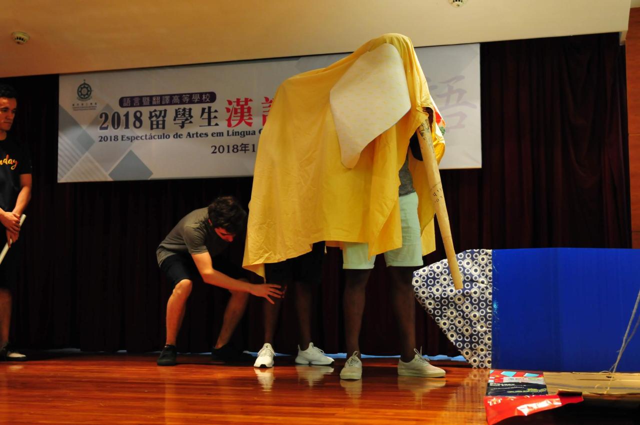 另外,“留學生漢語才藝匯演” 安排在匯智樓演講廳舉行,各年級的國際學生組織上臺獻藝,節目形式豐富,內容生動有趣,有小品、相聲、詩歌朗誦等。其中二年級的學生集體合作表演了舞臺劇“曹沖稱象”;一年級的學生在小品“吃飯”中串演曲藝、詩歌朗誦;三年級的學生則用中葡文朗誦了葡萄牙著名詩人賈梅士的長詩《葡國魂》片段,現場氣氛熱烈。值得提及的是,一年級的國際學生以僅學了不到半年的中文表演小品,並串唱中文歌曲、詩歌朗頌。活動凸顯了國際學生學習中文的積極態度,反映了理工提高國際學生中文水平的教學成效。