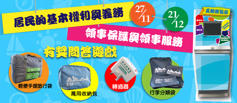 為加深居民對《澳門特別行政區基本法》中澳門居民的基本權利與義務的認識,以及推廣領事保護與領事服務的知識和在海外遇到困難的求助方法,身份證明局推出“居民的基本權利與義務、領事保護與領事服務”有奬問答遊戲,由即日起至2018年12月21日,一連四週送出精美禮物,歡迎澳門居民踴躍參加。