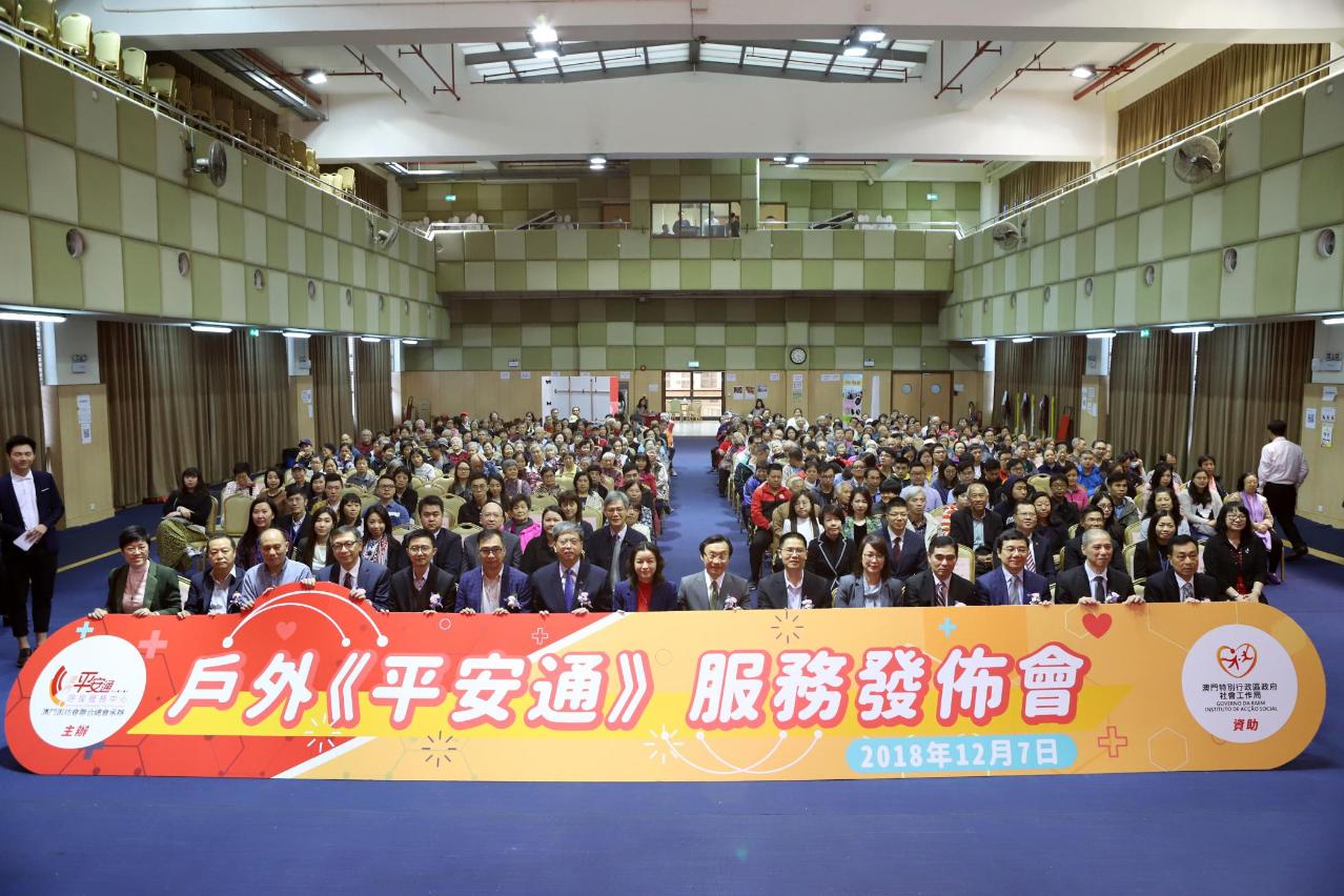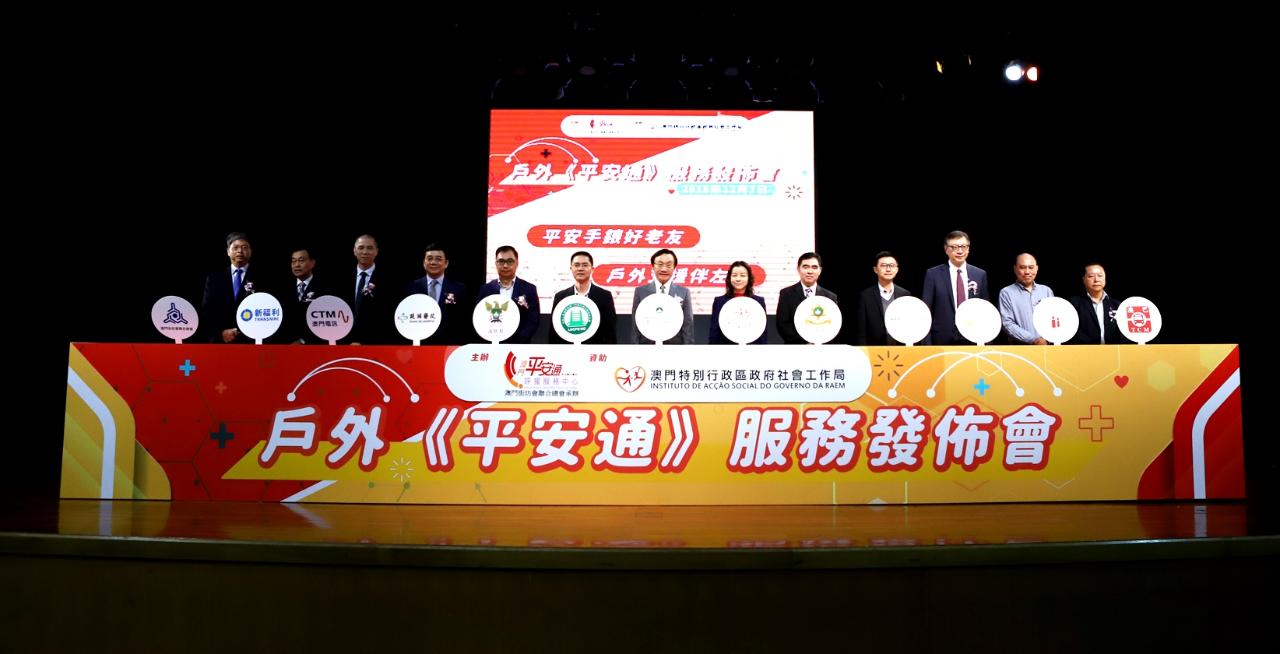 “戶外緊急呼援服務”發佈會今(7日)下午3時於澳門街坊會聯合總會社區服務大樓6樓舉行。社會文化司譚俊榮司長、社會工作局黃艷梅局長、中央人民政府駐澳門特別行政區聯絡辦公室社會工作部姜正宇處長、澳門街總梁慶球會長、吳小麗理事長,治安警察局行動廳李鏡賢代廳長、消防局劉皓偉處長、行政公職局公職福利處梁少峰處長、鏡湖醫院馬學章院長、銀河娛樂集團董事會呂耀東副主席、澳門電訊有限公司黃永儉商業服務拓展及方案總監、澳門弱智人士家長協進會葉國根副理事長、澳門公共汽車股份有限公司鄭炳燦副總經理,以及澳門新福利公共汽車有限公司鄭建中總監主持了啟動儀式。是次發佈會有來自各公共部門、社會服務機構代表、戶外平安通服務使用者等逾300人出席。