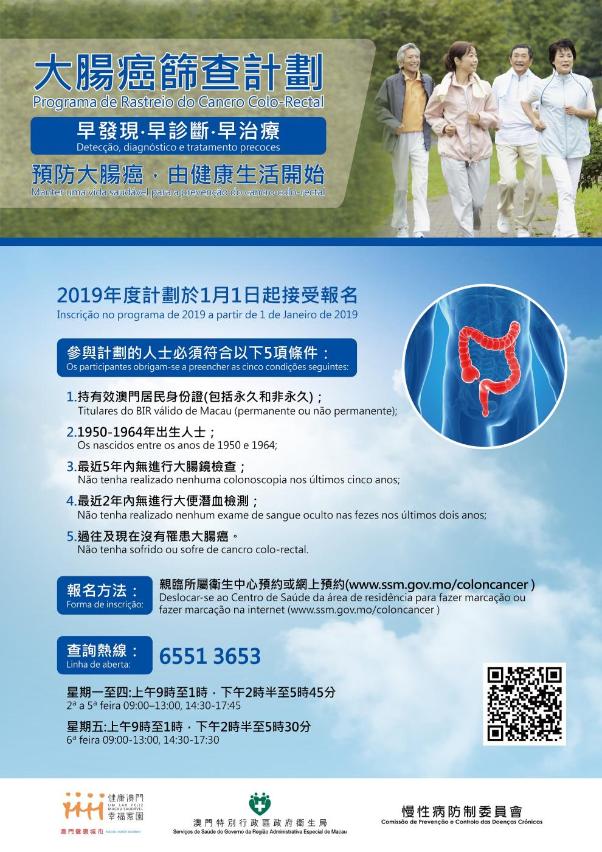 為擴大服務層面,衛生局將在2019年1月1日起把參加對象的年齡下調至55歲,即1950年至1964年出生的人士大,服務範圍將覆蓋55至69歲的澳門居民。即日起,符合以下條件的澳門居民可登入大腸癌篩查專頁(www.ssm.gov.mo/coloncancer)進行網上預約,亦可親臨所屬衛生中心預約諮詢服務。欲瞭解更多相關資訊,可瀏覽上述專頁或於辦公時間致電65513653查詢。