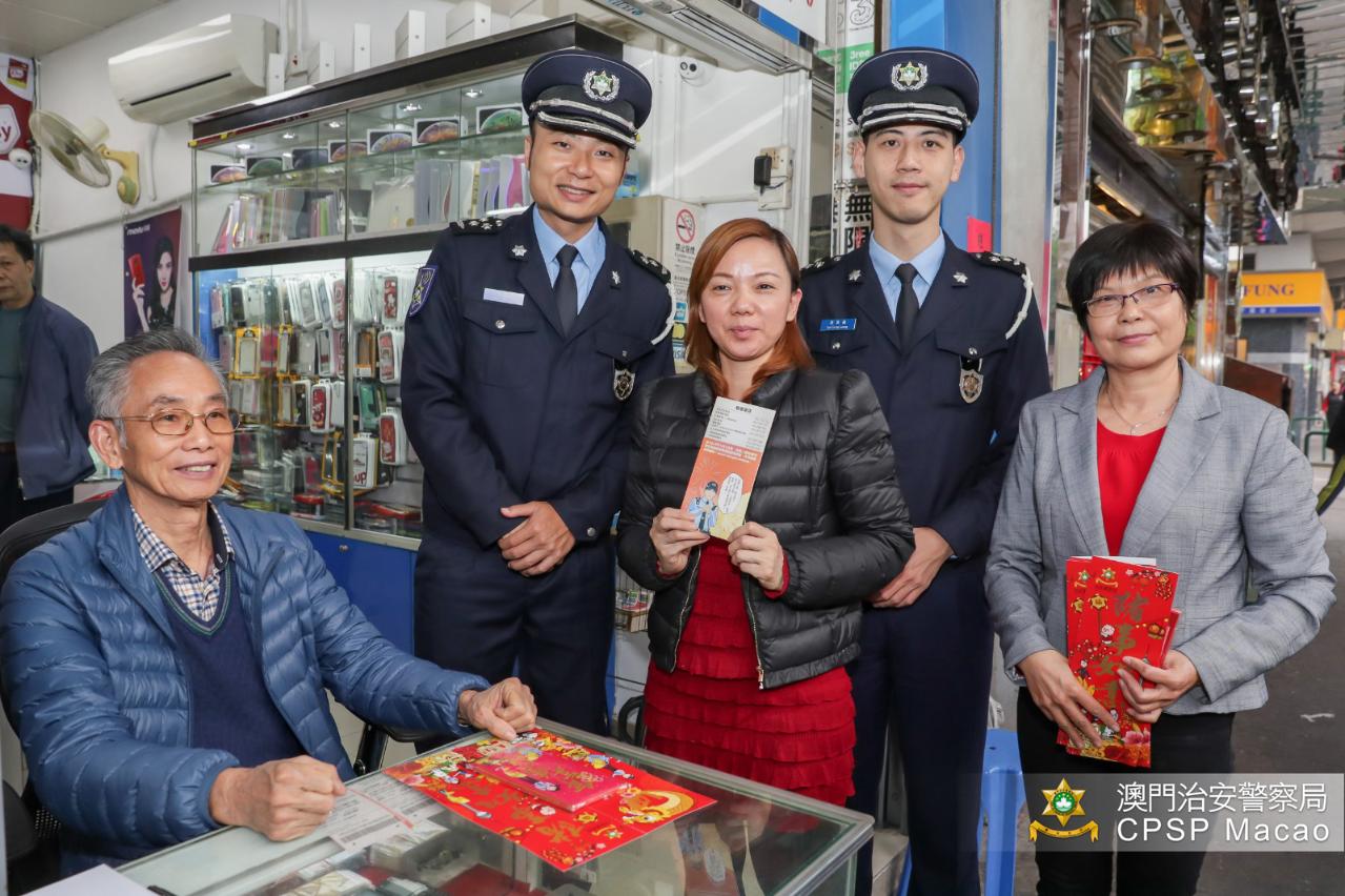 治安警察局人員聯同街坊總會北區辦事處代表向商戶進行冬防宣傳