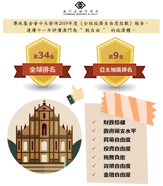 傳統基金會今天發佈2019年度《全球經濟自由度指數》報告,連續十一年評價澳門為“較自由”的經濟體。澳門的總體經濟自由度評分為71.0,較2018年度的70.9為高,並明顯高於世界及區內的平均水平,在全球180個經濟體中排名第34位。在亞太地區43個經濟體中,澳門排名第9,僅次於香港、新加坡、新西蘭、澳洲、台灣地區、馬來西亞、韓國及日本。