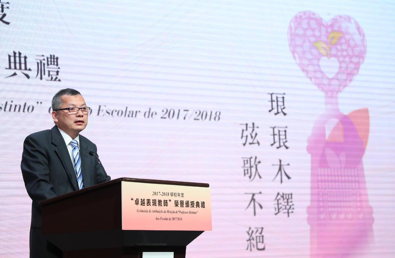 老柏生致辭時表示,教育在社會資訊化和智慧化的發展大局中須要轉型及創新,而教師是支撐人才培養、助力教育持續進步、促進社會發展的重要基石。特區政府通過頒授“卓越表現教師”之崇高榮譽對有卓越表現的教師表示嘉許及崇高的敬意,鼓勵所有教師在教育過程中努力追求卓越的表現,共同實現“教育興澳”、“人才建澳”的美好願景及使命。