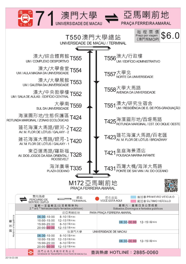 為提升巴士服務、進一步便利澳門大學師生出行,3月9日(周六)首班車起,71路線巴士往澳門大學方向由原線駛至“蓮花海濱大馬路/銀河-2”站後,新增停靠“海濱圓形地/生態保護區”站,而往亞馬喇前地方向則由原線駛至“澳大/研究生宿舍”站後新增停靠“海濱圓形地/西堤馬路”站。